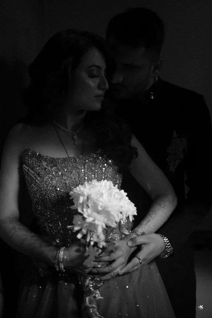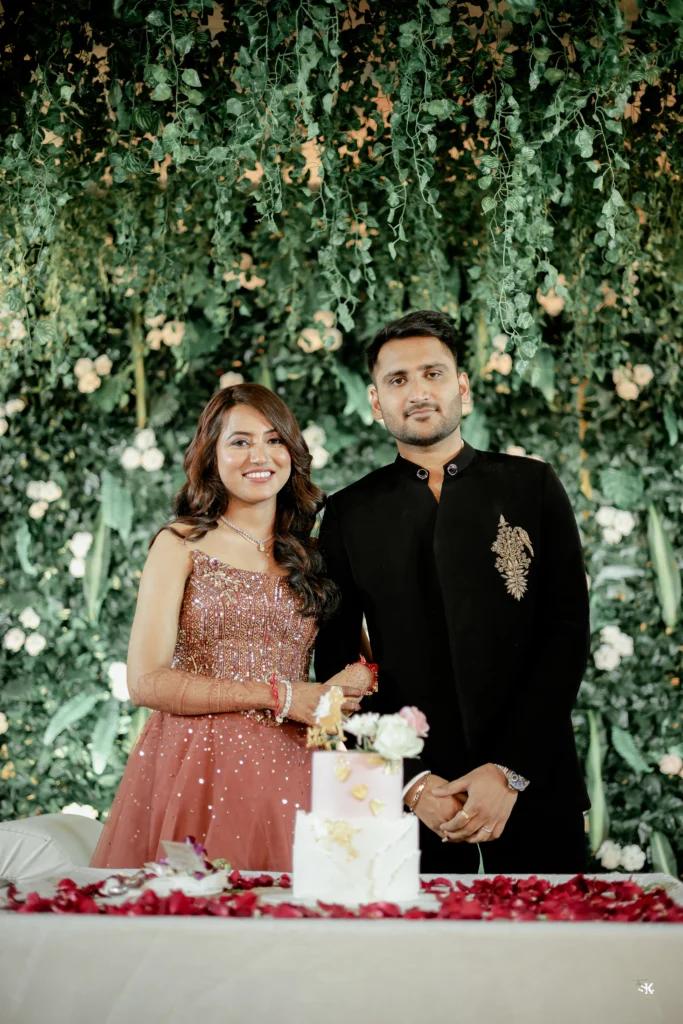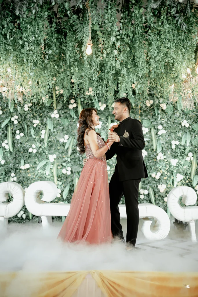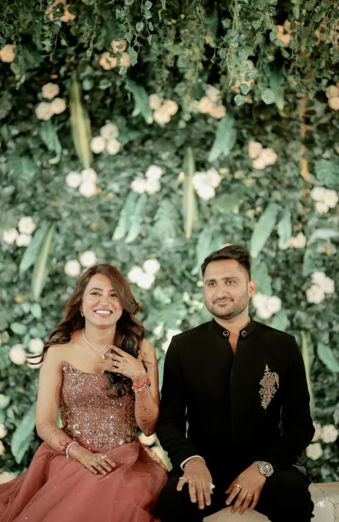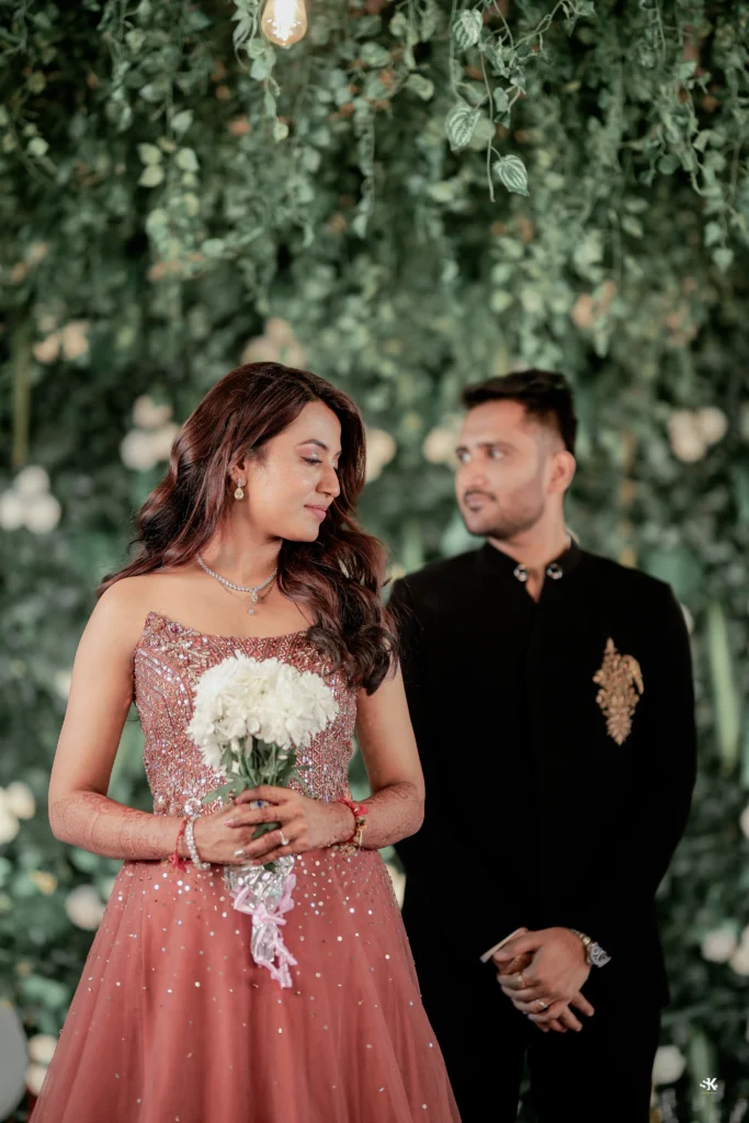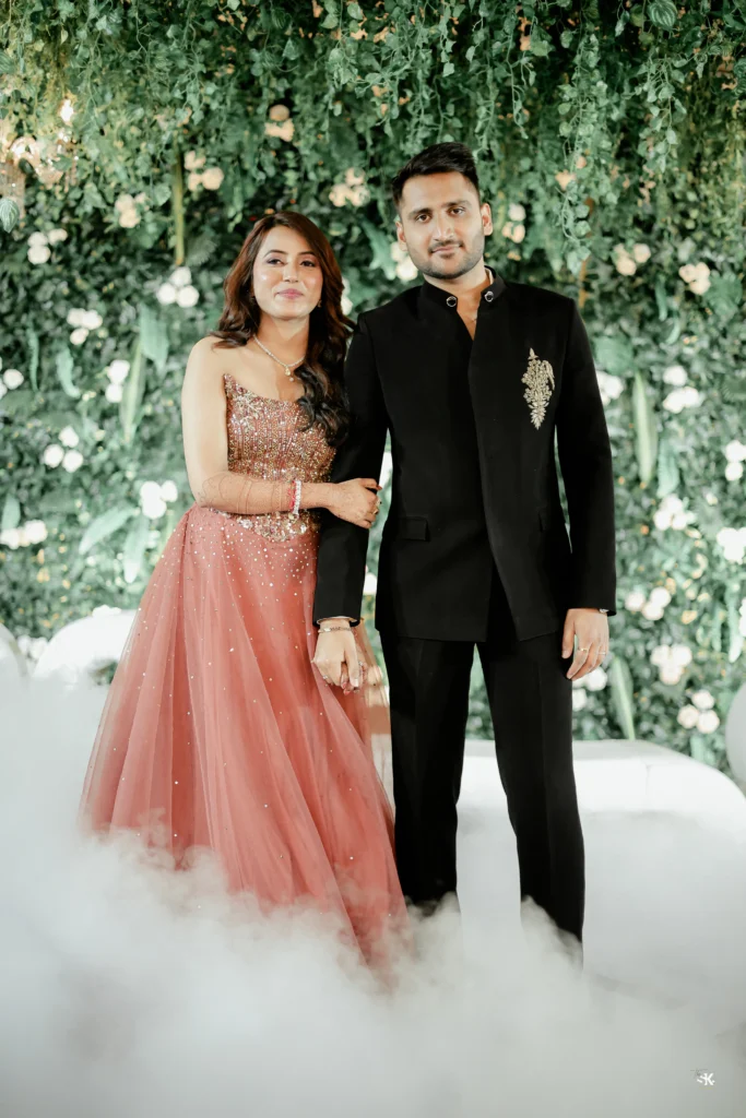 A timeless portrait of elegance and celebration. Set against a lush floral backdrop with soft cascading greens, this image captures the couple in a moment of quiet confidence and togetherness. The graceful detailing of the attire, gentle expressions, and cinematic lighting are complemented by a subtle mist effect, adding depth and a dreamlike atmosphere. Shot with a focus on balance, texture, and emotion, this frame reflects my signature approach—elevated storytelling through refined composition and natural expressions.