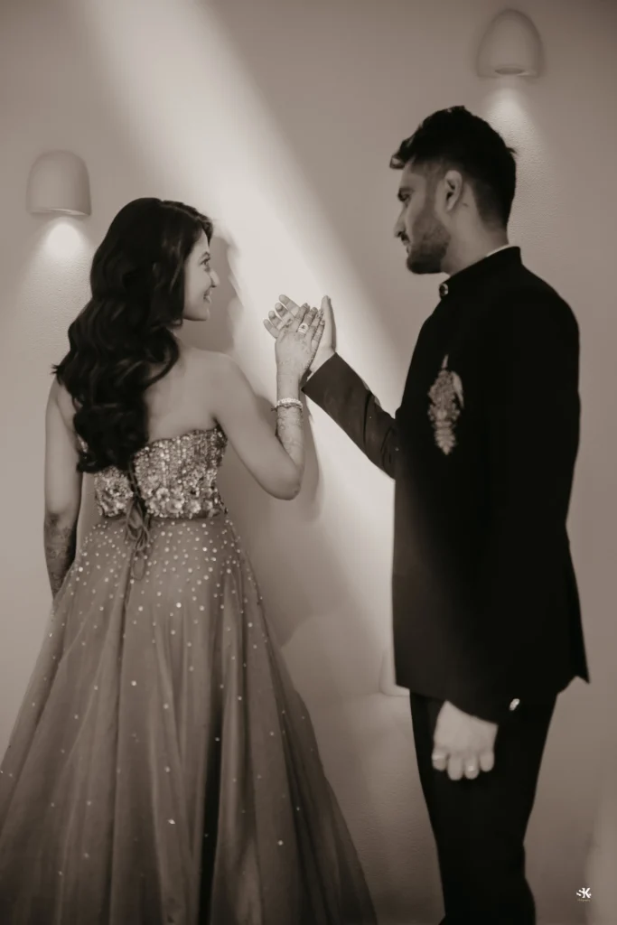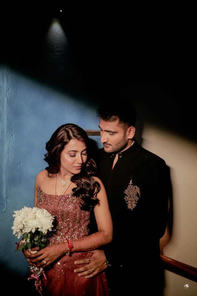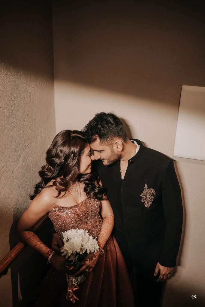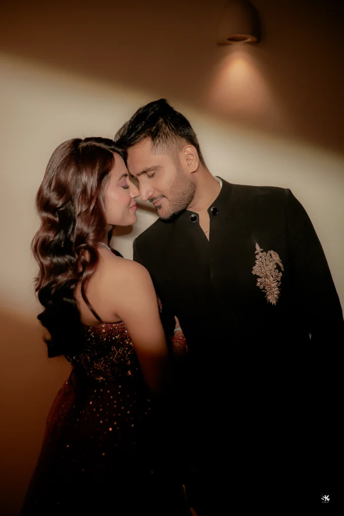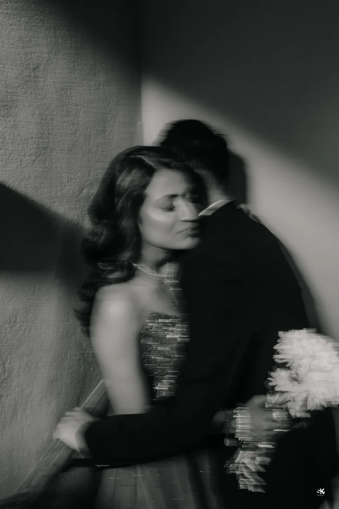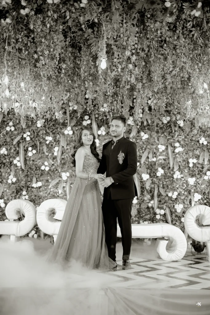 A timeless portrait of elegance and celebration. Set against a lush floral backdrop with soft cascading greens, this image captures the couple in a moment of quiet confidence and togetherness. The graceful detailing of the attire, gentle expressions, and cinematic lighting are complemented by a subtle mist effect, adding depth and a dreamlike atmosphere. Shot with a focus on balance, texture, and emotion, this frame reflects my signature approach—elevated storytelling through refined composition and natural expressions.